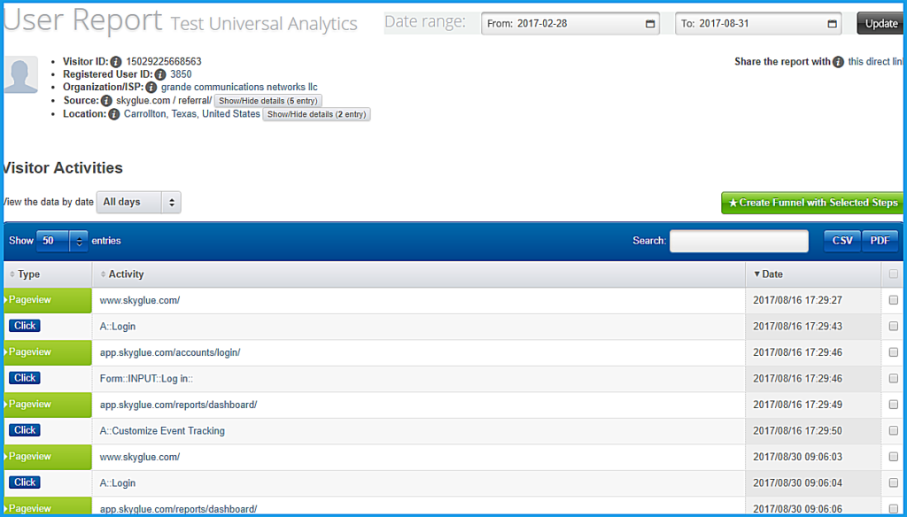 Your SkyGlue user report is connected to your Google Analytics account. SkyGlue custom GA link lets your view your visitor journey in your Google Analytics account directly.